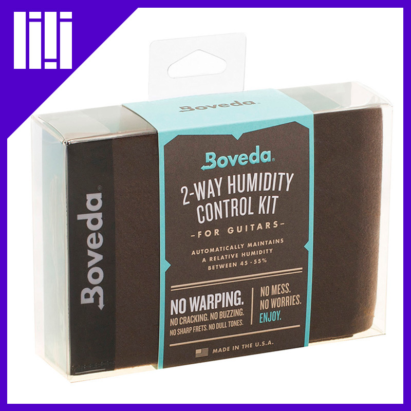 Boveda恒湿袋是一小包带有清晰湿度标签的液体,恒湿袋放置在可以进行双向湿度控制的插袋中。袋子上的标签显示了吉他所需的标准湿度,双向湿度控制指的是,如果环境湿度低于标准湿度,Boveda可以让袋内的液体缓慢向外分散从而提高湿度;如果环境湿度高于标准湿度,Boveda能够吸收多余的水分让环境湿度降低到标准水平。