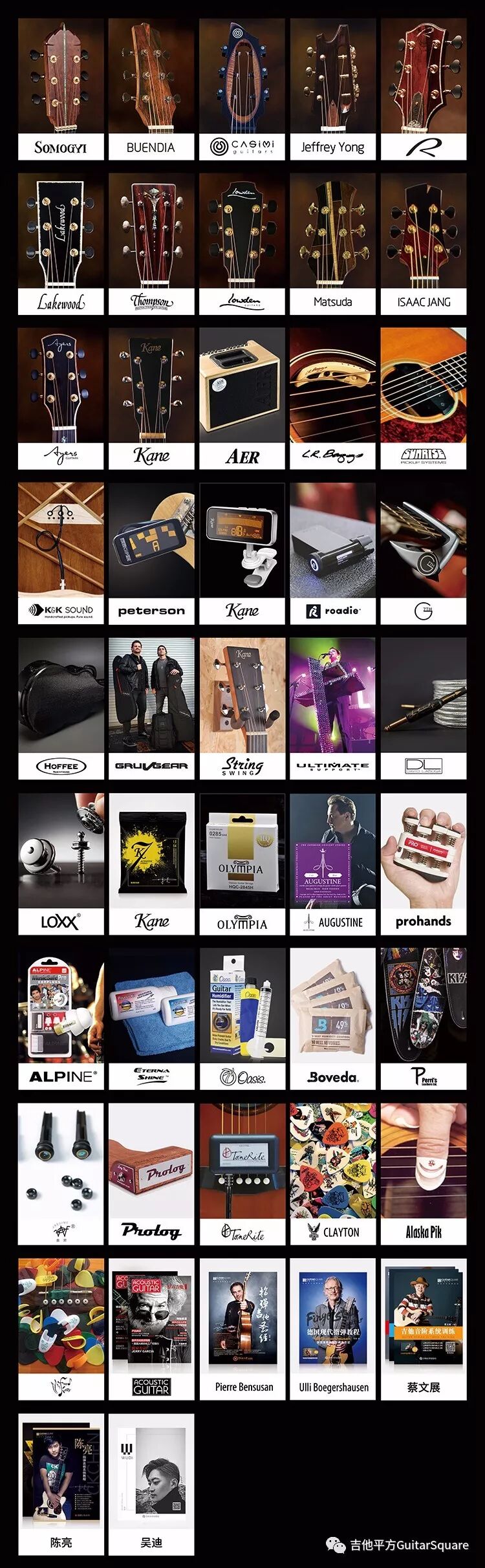 Kane 原声吉他、AER 原声音箱、GruvGear专业琴包、Peterson 调音器节器、Sunrise 拾音器、K&K Sound 专业拾音器、DL 发烧级连线、L.R. Baggs 拾音器、G7th 变调夹Perri’s 专业背带、StringSwing 乐器展示架、Ultimate专业琴架、ProHands 指力训练器、Oasis 加湿器、EternaShine 专业乐器护理、LOXX 精品背带扣、ToneRite 专业开声器、Alpine 专业耳塞、Boveda 乐器湿度均衡器、Alaska 指环、Augustine 古典弦、Fred Kelly 指套、Clayton高品质拨片、Awesome奥昇AcousticGuitar 《原声吉他》杂志、PierreBensusan 《指弹圣经》、UlliBogershausen《德国现代指弹教程》、陈亮指弹教程&无题专辑、《吴迪》同名专辑……